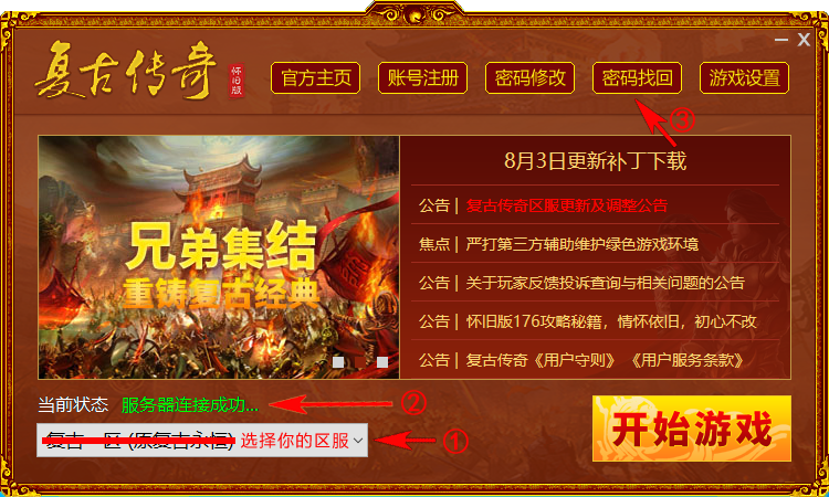 一、打开复古传奇登陆器,选择好您要找回密码的服务器(如下图1)
